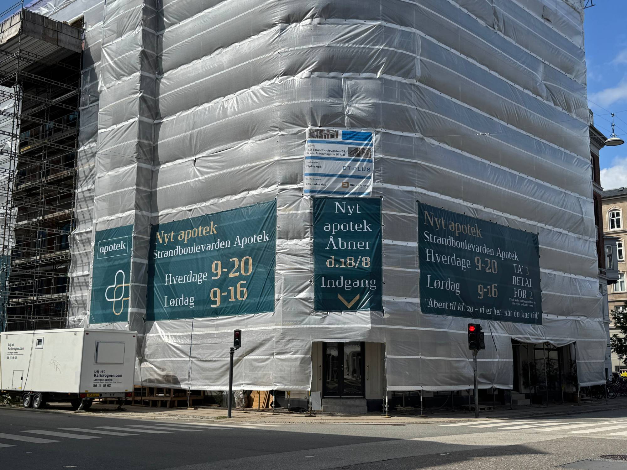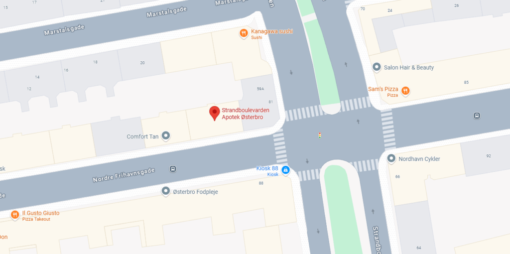 Apoteket ligger på adressen Nordre Frihavnsgade 81 – i krydset med Strandboulevarden.